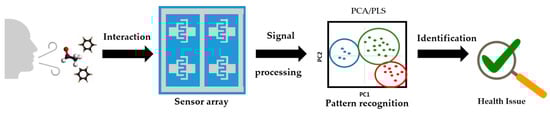 Scheme of the process to improve the selectivity issue. Biomarkers from human breath samples interact with different sensitive layers of the sensor array. Response features are treated by a dimensionality reduction or clustering step (e.g., principal component analysis, PCA) and a classification or regression step (e.g., partial least squares, PLS) may be used for identifying the presence of certain gas compounds associated with health problems.