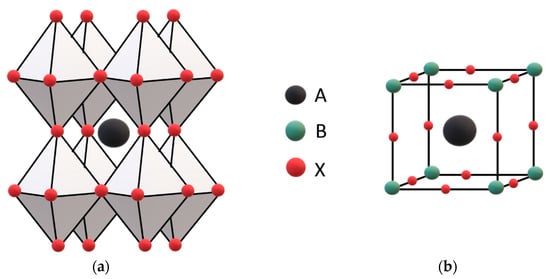The main perovskite structure comprises the formula ABX3, where A and B are cations of different sizes, while X corresponds to an anion. The crystalline structure is arranged in octahedra, in which every cation B is enclosed at the center of the octahedron and coordinated with 6 anions X that are located at the corners. Regarding cation A, this is coordinated with 12 anions, resulting in a cation A located at the center and surrounded by eight octahedra (Figure 2a). Thereby, this arrangement results in a cubic unit cell, where the cations A and B are located at the center and the corners of the unit cell, respectively, while the anion X occupies the edges of the unit cell (Figure 2b).
