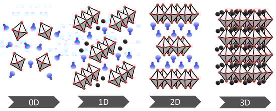 Despite this wide range of feasible perovskite compositions, they can also be synthesized in a variety of forms. Specifically, from zero- to three-dimensional perovskite nanostructures have been obtained (Figure 3). This is mainly possible by changing the size of the cation A located at the center of the unit cell (enclosed between the octahedra), leading to a modulation of the perovskite dimensionality [48]. In other words, a larger radius of cation A leads to greater distances between octahedra, resulting in lower dimensions. Thereby, their intrinsic properties and in consequence their sensing performance can be also modulated by changing the morphologies used [49,50]. Indeed, different perovskite nanostructures can be employed for the creation of hybrids with other nanomaterials, such as dichalcogenides, graphene, or metal oxides [51]. This outstanding versatility and these properties seem to fulfill the demanding requirements for the next generation of electronics, opening new perspectives to use perovskites in gas sensing devices.