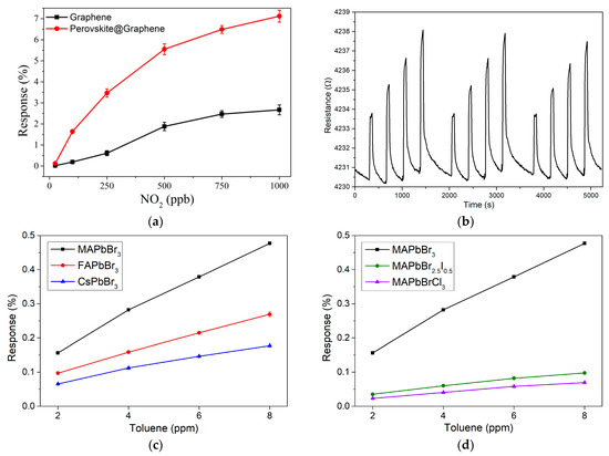 Casanova-Cháfer et al.’s first approach [128] was loading graphene with methylammonium (MA) bromide perovskite (MAPbBr3) nanocrystals for the detection of pollutants in the atmosphere. The short- or long-term exposition to these gases may have a hazardous effect on human health. In this regard, toxic gases such as NO2 and NH3 were detected at ppb and ppm levels, respectively. Indeed, the limits of detection (LOD) were situated below the threshold limit values (TLV), offering higher sensitivities (up to 3-fold) when graphene was decorated with perovskite nanocrystals than their bare graphene counterparts (Figure 5a). The nanohybrid developed showed higher sensing responses than perovskite thin films-based sensors [85,89], demonstrating the outstanding sensing performance of this perovskite–graphene implementation. Not limited to this, a second approach [119] was conducted by loading graphene with different perovskite nanocrystals. In particular, the role of different anions and cations was elucidated by preparing six compositions. Considering the ABX3 perovskite structure, three cations A (methylammonium, MA (CH3NH3+); formamidinium, FA ((NH2)2CH+); cesium (Cs+)), and three halide anions X (Cl−, Br−, and I−) were studied. Trace levels of aromatic VOCs such as benzene and toluene gases were measured (Figure 5b), offering stable, reproducible, and sensitive sensing readouts. These compounds are associated with several health issues, such as sub-clinical lung cancer, when present in exhaled breath [7]; therefore, the use of perovskites opens new possibilities to develop sensing devices for biomarker detection. It is worth noting that when bare graphene was exposed to VOCs it was not possible to distinguish the resistance variation from the noise level. As a consequence, the sensing responses obtained could be attributed to the effect of the halide perovskites. In other words, perovskite nanocrystals act as chemical receptors, while graphene mainly acts as a charge conductor. Furthermore, significant differences in the sensing performance can be observed by changing the perovskite composition. Experimental results showed that MA cation presents higher sensitivities than FA and Cs (Figure 5c), while Br− anions also offer better sensing responses than Cl− and I− (Figure 5d).