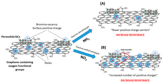 Synoptic illustration of the sensing mechanisms for graphene loaded with perovskite nanocrystals. (A) When halides perovskites interact with electron-donor gas, an excess of positive charges is neutralized at the defective perovskite surface, resulting in a decrease of the local hole concentration of the p-type graphene, and thereby the resistance increases. (B) When halide perovskites interact with electron-acceptor gas, positive charges are formed at the nanocrystals, being transferred to the graphene. As a result, the resistance decreases. Reproduced from Sensors MDPI 2019, 19 (20), 4563.