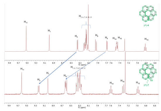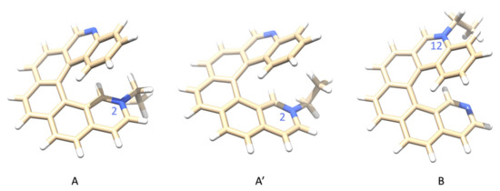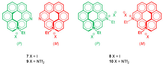 - huge positive shift of reduction peak potentials with strong reciprocal interaction between N sites for cations: Parent diazahelicene 4 features a complex reduction peak system, although starting with a monoelectronic chemically and electrochemically reversible peak. This can be assumed to account for reductions on both helicene sides, in the −2.2/−2.8 V range, similar to that formerly observed for the monoazahelicene case. There are, however, differences in peak potentials and multiplicity, consistently with the change in the nature of the two terminals. Instead in the case of 9 a reduction peak is observed at −1.52 V, i.e., much more positive respect to 4, as the nitrogen site, becoming cationic, now provides a preferential site for the first reduction. However, such potential is significantly less positive than the one observed in the case of the monoaza analogue. Since in monoazahelicene salts it has been observed that the first reduction potential is nearly constant, regardless of the position of the nitrogen atom, such a large potential difference could be ascribed, again, to the interaction in space between the aza cation and the free aza terminal, making the first reduction site less electron poor. At the same time, the reduction peak system in the −2.2/−2.8 V range looks much simpler compared to 5-aza[6]helicenium, and should correspond to reduction of the non-alkylated aza site. The azahelicenium double salt 10 features a neat couple of first reduction peaks (spaced about 0.5 V) that, considering again the above remarks about the first reduction potential of an aza cation, should be likely described as the response of two nearly equivalent redox sites, with significant reciprocal interaction along the carbohelicene chain as well as across space. This was also observed in a similar literature case [12], for which two reversible monoelectronic twin peaks are reported at −1.32 and −1.59 V. However, compared with ref. [12], in the case of 10 both reductions occur at less negative potentials, consistently with the overall more efficient conjugation. In our case, the distance between the peaks is higher, which could be ascribed to stronger reciprocal interactions. It is also worth mentioning that in cases 9 and 10, where cation reduction results in radical formation, a possible follow-up is dimerization [12,13].