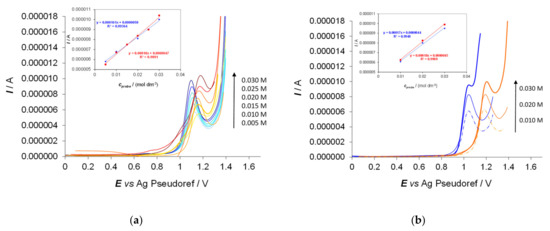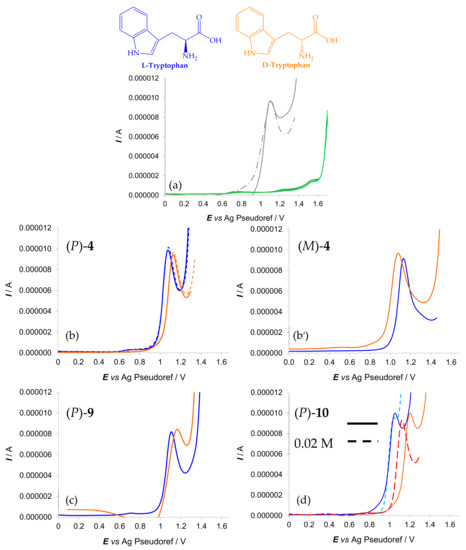 - Testing 9 and 10 with L- and D-Trp in the 0.005–0.03 M concentration range, a linear dynamic range with very good correlation coefficients is observed for the peak currents as a function of the concentration for both enantiomers (Figure 12). Thus, quantification through peak current analysis can be added to configuration assignment based on the peak potential.