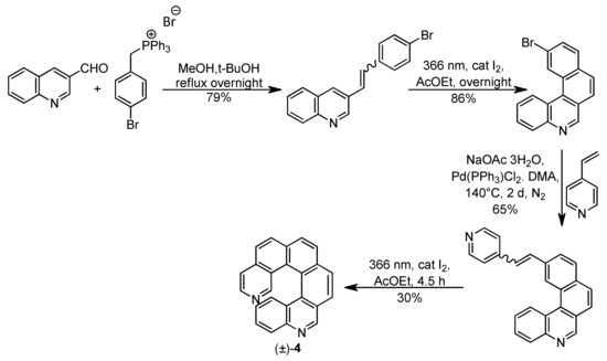 - Bazzini, C.; Brovelli, S.; Caronna, T.; Gambarotti, C.; Giannone, M.; Macchi, P.; Meinardi, P.; Mele, A.; Panzeri, W.; Recupero, F.; et al. Synthesis and Characterization of Some Aza [5] helicenes. Eur. J. Org. Chem. 2005, 2005, 1247–1257. [Google Scholar] [CrossRef]