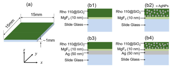 For coating the SiO2 layer that has both AgNPs and dye molecules embedded in it, we add AgNPs with their average diameters of 75 nm (nanoComposix, Co., Ltd., San Diego, CA, USA) to the mixture comprised of a SiO2 precursor prior-mixed with dye solution mentioned above. The particle concentration is 0.125 mg/mL. We spin-coat a SiO2 layer out of this mixture onto the MgF2 surface. The dimension of the fabricated chips is shown in Figure 1a.
