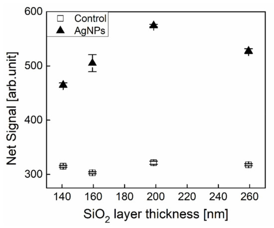 Figure 4 shows the net fluorescent signals (dark solid triangles) detected with the chip of Figure 1(b2) in comparison with control signals (dark empty squares) detected with the chip of Figure 1(b1) installed in the setup of Figure 3a. Use of AgNPs enhances the net fluorescent signal over the control counterpart at each SiO2 thickness due to enhancement of the dye excitation rate by AgNPs-induced LSPR. Moreover, non-negligible dependence of the net signal on SiO2 thickness is found despite the fact that all the SiO2 layers of the four different thickness involve the same number of dye molecules and AgNPs. However, it is unclear how the thickness of SiO2 layer involving dye molecules and AgNPs, affects the LSPR induced enhancement of excitation rates to explain such thickness dependence.