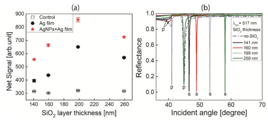 It is also noted that s-polarization would support CPWR modes [28,29] with a certain SiO2 thickness dependence of at in a Kretschmann configuration. Furthermore, in a reverse Kretschmann configuration, the presence of waveguide is known to induce the SPCE-like directional emission for s-polarization as well as p-polarization [22]. Therefore, the above-mentioned SiO2 thickness dependence of strength of waveguide-surface plasmon coupling can account for the thickness-dependent fluorescent net signal (black solid circles in Figure 5a), as deriving from the thickness dependent waveguide-modulated SPCE.