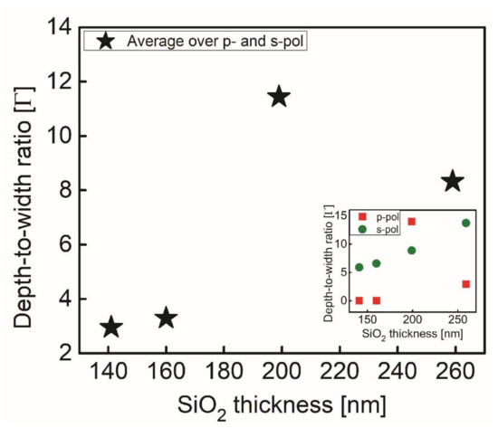 Average of depth-to-width ratio () of the reflectance dip over two polarizations (p and s) at each SiO2 thickness. Inset shows for p- and s-polarizations at each SiO2 thickness.