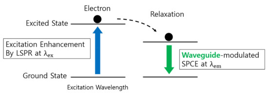 The constructive dual coupling of dye molecules with the metal nanostructures at two distinct wavelengths, , and , i.e., the coupling of dye molecules with AgNPs at and that with the Ag-film for waveguide-modulated SPCE , is schematically illustrated in Figure 7. It occurs owing to the spectral overlap between AgNPs LSPR and the dye excitation, and to the spectral overlap between waveguide-modulated SPR and the dye emission.