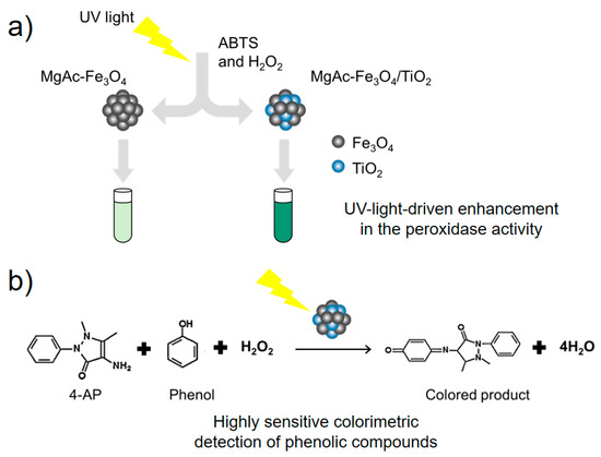 Schematic illustrations for (a) UV-light-mediated enhancement in the peroxidase-like activity of MgAC-Fe3O4/TiO2, and (b) its utilization for colorimetric detection of phenolic compounds.