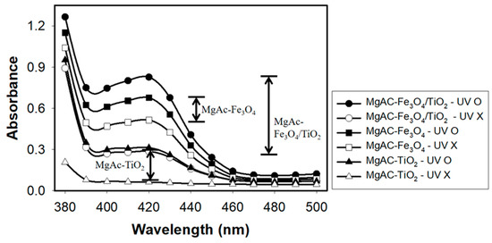 Absorption spectra for the oxidation of ABTS in the presence of H2O2 by MgAC-Fe3O4/TiO2, MgAC-Fe3O4, and MgAC-TiO2, with or without UV-light irradiation.