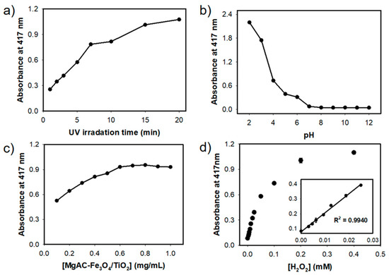 Effects of (a) duration of UV-light irradiation, (b) buffer pH, and (c) employed concentration of MgAC-Fe3O4/TiO2 on the peroxidase activity. (d) Dose-response curve and calibration plot (inset) for H2O2 determination using UV-light-driven MgAC-Fe3O4/TiO2-based system.