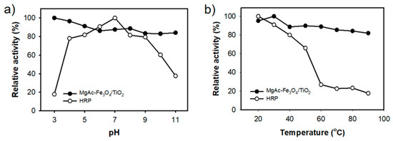 Stabilities of MgAC-Fe3O4/TiO2 and HRP with varying (a) pH and (b) temperature.