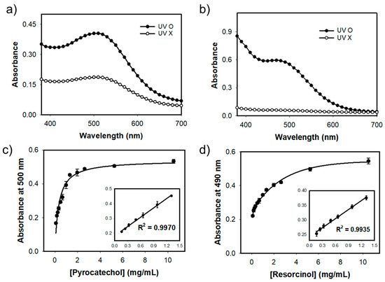 Effects of UV-light irradiation for the detection of (a) pyrocatechol and (b) resorcinol, and dose-response curve and calibration plot (inset) for (c) pyrocatechol and (d) resorcinol using UV-light-driven MgAC-Fe3O4/TiO2-based system.