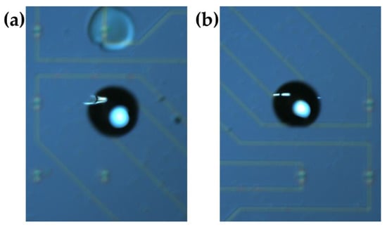 Optical images of the microdrops of aptamer solutions, dispensed onto the surface of individual 3-µm-wide NRs No. 1, No. 4 (a), and No. 6 (b). The images were obtained via the built-in color CCD camera of the iONE-600 spotter.
