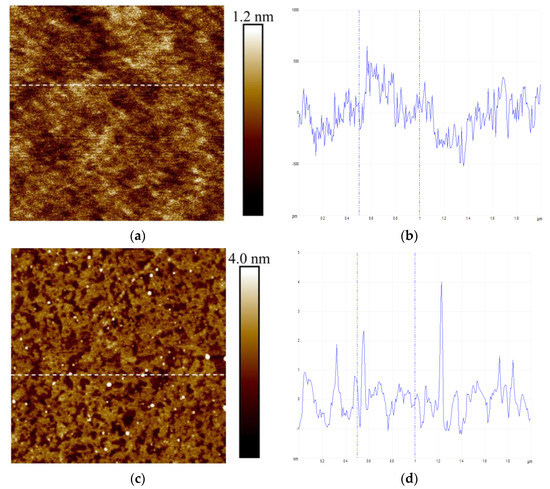Typical AFM images of the SOI substrate surface (a,c) and cross-section profiles corresponding to the thick dashed lines in the AFM images (b,d), obtained after the silanization of the substrate surface (a), and after the incubation of the substrate in 10-nM solution of CA 125 (b). Scan size: 2 × 2 µm2; Z scale: from 0 to 1.2 nm (a), from 0 to 4.0 nm (b).