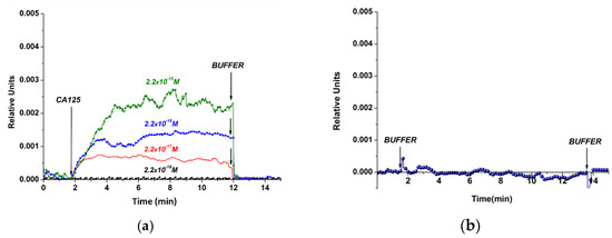 Biosensor-based detection of CA 125 has recently been reported in a number of papers. Hence, Szymanska et al. [33] developed a surface plasmon resonance imaging (SPRI) biosensor for the label-free detection of CA 125 in human serum; in this biosensor, polyclonal antibodies against CA 125 were employed as molecular probes; however, no real-time measurements were reported in this paper [33]. Mandal et al. [34] reported the fabrication of an electrochemical (carbon nanotubes)-based biosensor, in which monoclonal antibodies against CA 125 were utilized as molecular probes; the authors, however, performed their experiments at a rather high (560 μg/mL) concentration of CA 125. Attia et al. [35] developed a luminescence-based assay for the detection of CA 125 in serum; in this assay, acridinium-ester-labeled monoclonal antibodies were employed as molecular probes, and fluorescein-labeled monoclonal antibodies were used as secondary antibodies—that is, additional labels were employed. Petrova et al. [36] developed an interesting photonic-crystal-based biosensor for the multiplexed, label-free, real-time detection of CA 125 and two breast cancer markers (human epidermal growth factor receptor 2 and cancer antigen 15-3). Monoclonal antibodies against the target biomarkers were used as probe molecules [36]. It should be emphasized that, in contrast to aptamers, antibodies are quite expensive, while exhibiting poorer chemical and time stability, thus leading to the high cost of the assay.