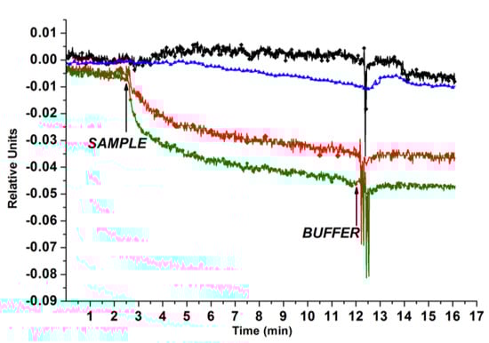 The curves displayed in Figure 7 indicate a significant change in the level of the NR biosensor signal after the addition of the sample of ovarian cancer patients (red and green curves). This is in contrast to the case of the control samples of healthy volunteers (black and blue curves), where virtually no change in the biosensor signal was registered. It is interesting to note that the level of the signal obtained upon the analysis of sample #67 (serous papillary adenocarcinoma, TNM stage T3cNXM1)—of a patient with a more serious tumor stage—is considerably higher than that in the case of sample #60 (serous moderate ovarian tumor, TNM stage T1ANXM0). This indicates that the more serious the tumor stage is, the higher is the level of the biosensor signal.