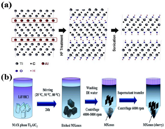 (a) Ti3C2Tx synthesized by HF etching (Reproduced with permission from [50]. Copyright 2011, John Wiley and Sons); (b) Ti3C2Tx synthesized by HCl + LiF etching (Reproduced with permission from [75]. Copyright 2020, the Royal Society of Chemistry).
