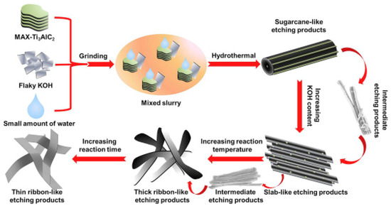 In recent years, there has been a lot of research on the synthesis of MXene by F-free etching, such as alkali etching [91,92,93,94], electrochemical etching [95,96,97], halogen etching [98,99], hydrothermal etching [90,100], and Lewis acid [74,101], etc. In theory, it is feasible to use alkali as an etchant to etch Ti3AlC2. Because Al can be dissolved by alkali owing to the high reactivity of Al. Li et al. [91] successfully synthesized Ti3C2Tx using the NaOH-assisted hydrothermal method. The experiment temperature was 270 °C and the concentration of NaOH solution was 27.5 M. The high temperature and NaOH concentration were conducive to the dissolution of Al (Figure 2). This was the first time that MXene has been synthesized by only alkali etching and many –OH and O terminals could be produced by this method. Based on alkali etching, scholars have developed other methods that cooperate with alkali etching. Zhang et al. [92] successfully synthesized Ti3C2(OH)2-MXene nanobelts with abundant surface hydroxyl terminals using a small amount of H2O-assisted KOH. The synthesis process is shown in Figure 3. KOH and water contents were essential to the etching process and could affect the thickness of MXene. The morphology of MXene could be controlled by KOH and water contents. Xue et al. [93] used a chemical combined ball milling method to etch Ti3C2 MXene with tetramethylammonium hydroxide (TMAOH) and LiCl solution. Figure 4 is the preparation process. The specific surface area of the F-free MXene reached 38.93 m2/g due to its hierarchical porous structure and the terminals which only were oxygen-containing groups (O/OH). Rafieerad et al. [94] used HCl-assisted KOH alkaline etching in order to synthesize Ta4C3Tx MXene. The biggest problem with alkaline etching was that Al and alkaline medium formed insoluble Al(OH)3 and AlO(OH) on the surface of MXene to hinder further etching. HCl was used to assist the synthesis. During the synthesis process, aluminum atoms passed through HCl to quickly chlorinated. It would produce soluble aluminum chloride (AlCl3), which might reduce insoluble aluminide and promote the etching. The synthesis process is shown in Figure 5.