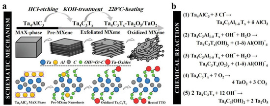 (a) Sketch map of the preparation of Ta4C3Tx by HCl/KOH; (b) The reaction equation of HCl/KOH to prepare Ta4C3Tx (Reproduced with permission from [94]. Copyright 2021, John Wiley and Sons).