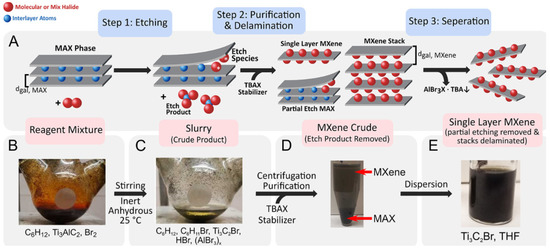 - Jawaid, A.; Hassan, A.; Neher, G.; Nepal, D.; Pachter, R.; Kennedy, W.J.; Ramakrishnan, S.; Vaia, R.A. Halogen etch of Ti3AlC2 MAX phase for MXene fabrication. ACS Nano 2021, 15, 2771–2777. [Google Scholar] [CrossRef] [PubMed]