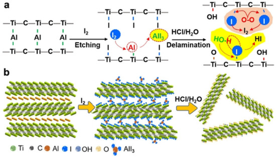 The bond schematic diagram (a) and the model schematic diagram (b) of the preparation of Ti3C2Tx by iodine etching (Reproduced with permission from [99]. Copyright 2021, John Wiley and Sons).