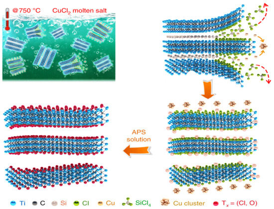 Lewis acid etching is a new fluorine–free etching method. Li et al. [74] immersed Ti3SiC2 in the CuCl2 Lewis salt. Redox reaction occurred between Ti3SiC2 and CuCl2 to etch the Si in order to form Ti3C2Tx MXene. Then, the obtained MXene was washed in ammonium persulfate solution (Figure 9). SiCl4, born during the reaction, could be used as an expansion agent to be embedded in the MXene layer. MXene embedded by water did not release any –OH, which meant that the hydrophilicity of the MXene surface was reduced. The Lewis acid etching method proposed here provides a new idea for preparing MXene without F. However, this method needs to be carried out at 750 °C. Excessively high temperature is detrimental to cost and product, so it still needs to develop the other F-free methods.