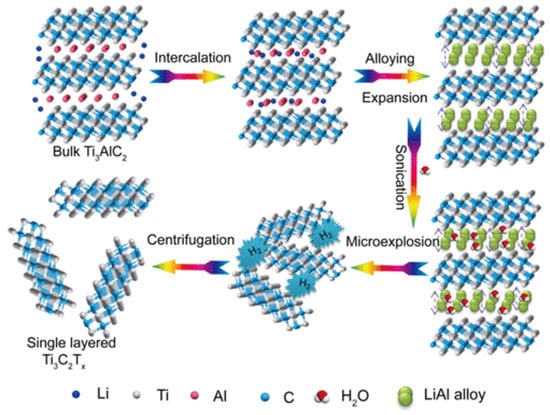 Schematic illustration of the preparation of Ti3C2Tx by lithiation-expansion-microexplosion (Reproduced with permission from [89]. Copyright 2019, American Chemical Society).