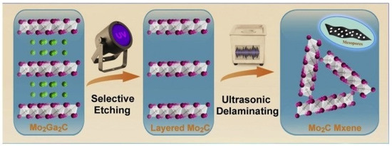 In MXene, Mo2Ga2C is an ultraviolet absorbing material, with excellent ultraviolet response characteristics [60]. According to the UV response characteristics of Mo2Ga2C, Mei et al. [60] successfully synthesized Mo2C MXene with high yield, high quality, and mesoporous structure using UV-induced etching within a few hours. The experimental procedure of UV–induced etching was: (1) The Mo2Ga2C precursor was etched by UV irradiation; (2) The MXene was peeled off with ultrasonic in order to obtain independent MXene nanosheets. The procedure is shown in Figure 11. This method was fast and did not involve HF acid. It was of great significance to MXene with UV response characteristics, but it limited its use to the general MXene, which is not sensitive to UV.