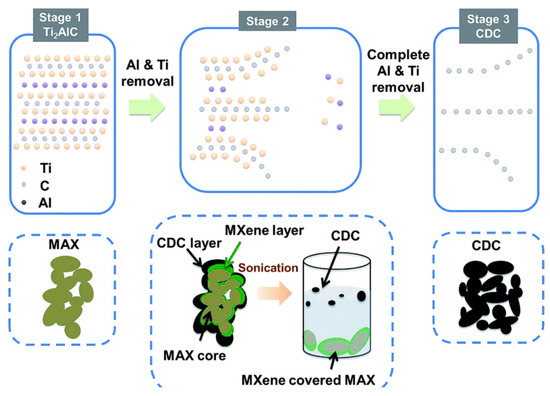 One of the methods to be mentioned in particular is electrochemical etching. Electrochemical etching would not only etch the A layer, but also over-etch the M layer. Sun et al. [95] successfully synthesized Ti2CTx MXene by electrochemical etching in HCl solution for the first time. The process of this method was: (1) Al was selectively getting rid of from the MAX phase; (2) The cathode potential increased and both Al and Ti have etched away, leaving carbide-derived carbon (CDC). The procedure is shown in Figure 12. The etched sample had three structures: carbide–derived carbon, MXene, and unetched MAX. MXene was separated from these structures by ultrasound. Since no fluoride ions were involved in the etching process, there were only –Cl, –O, and –OH terminals in MXene.