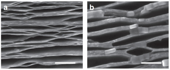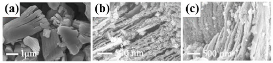 (a) SEM images before intercalation of f–Ti3C2 with HM and DMF; (b) SEM images after intercalation of f–Ti3C2 with HM and DMF (Reproduced with permission from [103]. Copyright 2013, Springer Nature).