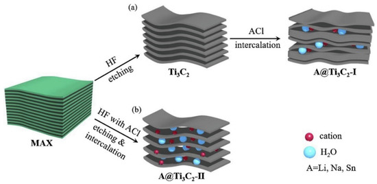 Generally, the intercalators are added after the end of etching. However, there will happen that the interlayer spacing may decrease after the adjunction of the metal cation. Hu et al. [110] proposed a one-step method to embed metal cations in MXene, regarding the metal cations as a part of the etchant instead of as an intercalator after the etching. This method was used to solve the problem of reducing spacing between layers after the intercalation of a cation. The two-step process was as follows: The etched MXene powder was dispersed in Li, Na, or Sn salt and stirred, and then the product was collected. The one-step process was as follows: The Ti3AlC2 powder was added to the mixture of HF and Li, Na, and Sn salt to collect the product. The procedure is shown in Figure 17. The study found that: (1) When using the one-step method, the interlayer spacing of MXene increased from 18.5 to 24.84 Å; (2) When the embedding process occurred after the etching process, the inter-layer spacing became smaller. Because the interlayer of MXene was occupied by water after the etching, the metal cations were unevenly distributed due to static electricity after embedding. The distance between the layers where the metal ions were embedded increased. It broke the stability of the water caused the loss of water and collapsed between the layers. So the inter-layer spacing became smaller when the embedding process occurred after the etching process. For the one-step method, the cations were evenly dispersed between the layers due to etching and embedding at the same time, so there was no collapse.