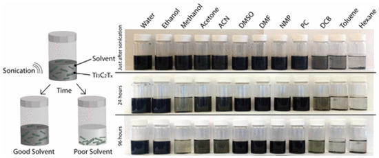 Dispersions of Ti3C2Tx in the 12 solvents (Reproduced with permission from [119]. Copyright 2017, American Chemical Society).