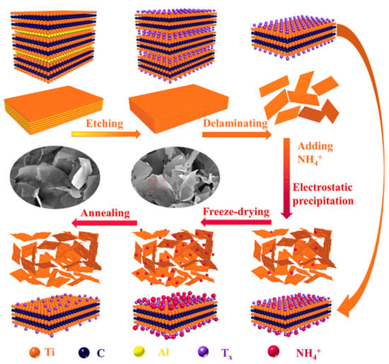 Surface modification is a common method to change the hydrophilicity of material surface and many methods have been developed based on surface modification. For example, Zhang et al. [124] used the solution-phase flocculation method to successfully prepare a large amount of low-layer Ti3C2Tx MXene for the first time. The solution-phase flocculation method mainly used ammonium ions to solve the re-stacking of MXene nanosheets. The solution-phase flocculation method was divided into the NH4+ method and the improved NH4+ method. The NH4+ method was to quickly synthesize a few-layer Ti3C2Tx powder by freeze-drying the electrostatic flocs which was formed by MXene colloids and adding subsequent removable NH4+ (Figure 22). In addition, all the methods discussed above are for the preparation of MXene suspension, but the solution-phase flocculation method could directly prepare MXene powder. The NH4+ method improved the dispersibility of MXene, because the negative charge on the surface of MXene was reduced after adding NH4+. The MXene sheets were mutually repelled by static electricity and were evenly dispersed in water. After freeze-drying and annealing, MXene nanosheets could be gathered. The improved NH4+ method is adding step-by-step layering and auxiliary centrifugation in the electrostatic flocculation process, which was mainly to shorten the freeze-drying time further. The improved NH4+ method shortened the preparation cycle and obtained a yield as high as 70%.