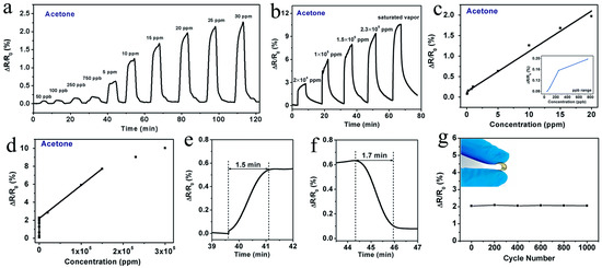(a) Dynamic response curve of 3D MXene gas sensor; (b) Plot of responses versus time for a 3D-M sensor upon exposure 50 ppm acetone concentration; (c) The relationship between response and acetone concentration; (d) Relationship between response and acetone concentration in a wide range up to saturated vapor; (e,f) The curve of the response and recovery time under 5 ppm acetone; (g) Response of the 3D-M sensor under 20 ppm acetone after different bending cycles (Reproduced with permission from ref. [130]. Copyright 2018, the Royal Society of Chemistry).