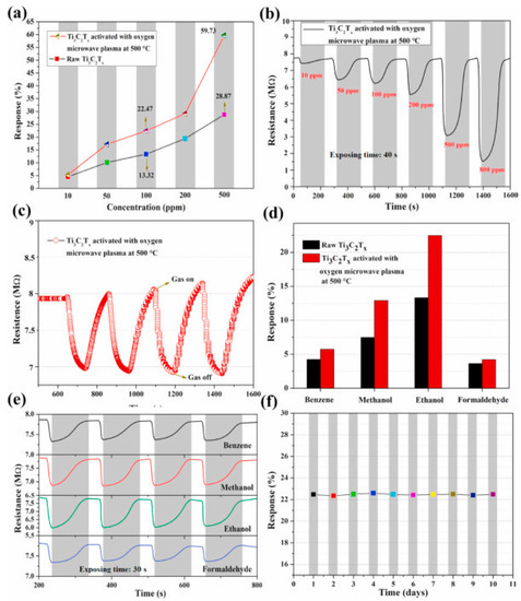 Using metallic materials to prepare gas sensors, it is necessary to consider that these low-noise metallic materials lack highly active gas adsorption sites. In 2018, Kim et al. [81] transferred Ti3C2Tx to a SiO2 wafer printed with gold sensing electrodes and fabricated a Ti3C2Tx MXene sensor with low noise, high conductivity and rich hydrophilicity on the surface. They have studied the gas response of acetone, ethanol, ammonia, propanal at room temperature. The study found that the sensor was susceptible to VOC gas and had a high response, however, it was not sensitive to other inorganic gases. The gas sensor had an excellent response to VOC gas. This was the first time that a sensor has been made to detect a variety of VOCs at room temperature. In 2019, Koh et al. [154] studied the effect of the interlayer expansion of Ti3C2Tx film on the gas sensitivity performance. In addition, Na+ was embedded in order to improve the swelling behavior. MXene was relatively insensitive to gas adsorption due to its high conductivity. However, since gas readily diffused between layers, interlayer expansion might dominate in terms of gas sensitivity. The study found that when ethanol was introduced, the interlayer spacing of MXene increased from 13.24 Å to 14.06 Å and the gas response increased rapidly; when ethanol was removed, the interlayer spacing of MXene decreased to 13.55 Å and the gas response decreased. This showed that the swelling behavior induced by gas was reversible and the interlayer expansion increased the gas response. The intercalation of metal ions into the interlayer of MXene would change the diffusion coefficient of H2O, which lead to the change of swelling behavior. It was found that proper Na+ intercalation could promote ethanol intercalation, which led to larger interlayer spacing. Because the dehydration caused by Na+ intercalation provided a location for ethanol intercalation, it would lead to swelling behavior. In 2021, Hou et al. [131] used oxygen plasma activated by microwave energy to treat Ti3C2Tx MXene and studied the gas sensitivity of activated Ti3C2Tx to different VOC gases. Figure 26a shows the gas response of pristine Ti3C2Tx and activated Ti3C2Tx to different ethanol concentrations at room temperature. It could be seen that the gas sensitivity performance of activated Ti3C2Tx was more excellent than that of pristine Ti3C2Tx. The response of activated Ti3C2Tx increased with the concentration of ethanol gas. The sensor had good stability and selectivity. After activation, the gas-sensing performance became better, because plasma could open the interlayer of MXene and increased the interlayer spacing and specific surface area. Plasma could also remove the fluorine terminal and increase the oxygen-containing terminal, thereby providing more adsorption sites to improve gas sensitivity. In an environment of 100 ppm ethanol, the response of Ti3C2Tx activated at 500 °C was 22.47 at room temperature (Figure 26c). The sensor prepared by MXene had a strong response to various VOC gases. It is undoubtedly unfavorable for the selectivity of the VOC gas-sensing response. If a specific VOC gas is to be detected, a highly selective VOC gas sensor must be developed. Virtual sensor array (VSA) is a single sensor that can generate multi-dimensional signals and identify different VOC gases accurately. Combining with measuring impedance spectroscopy, VSA can provide multi-dimensional information for distinguishing different types of VOC. Li et al. [155] used Ti3C2Tx to prepare a VSA, which could detect and identify different types of VOC with high accuracy and estimate the concentration of a single VOC in a VOC mixture. Based on the proposed VSA, the accuracy of ethanol concentration estimation was 93.4%. This high-level, high-precision identification technology could be used in various industries in order to solve the obstacle which was caused by the low sensor selectivity in gas detecting.