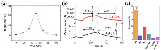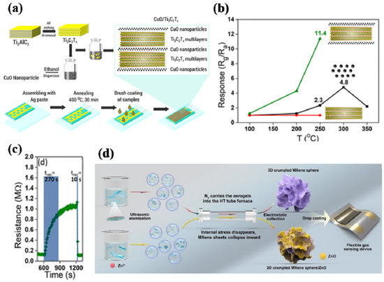 Because of rich surface functional groups, large specific surface area, large porosity, high conductivity, and other properties, MXene is considered as a promising sensor material with abundant gas adsorption active sites [127]. MXene can get fast charge transfer under low temperature conditions because of its good metal conductivity and high carrier mobility, leading the gas response to improve at room temperature [128]. For example, NH3 can interact with some oxygen terminals such as –OH and –O. MXene with a large number of oxygen–containing terminals can strongly interact with NH3, which helps to obtain excellent gas response [129]. Here, we will describe the performance of pristine MXene and MXene composite in gas sensors in detail. MXene composite includes metal oxide composite, polymers composite and Pd-MXene.