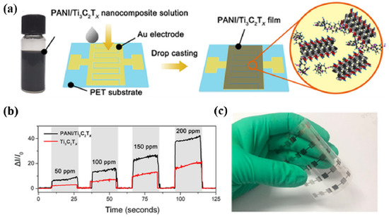 - Jin, L.; Wu, C.; Wei, K.; He, L.; Gao, H.; Zhang, H.; Zhang, K.; Asiri, A.M.; Alamry, K.A.; Yang, L.; et al. Polymeric Ti3C2Tx MXene composites for room temperature ammonia sensing. ACS Appl. Nano Mater. 2020, 3, 12071–12079. [Google Scholar] [CrossRef]