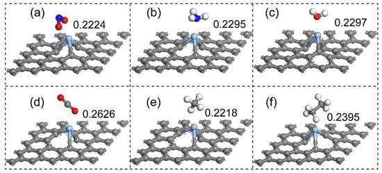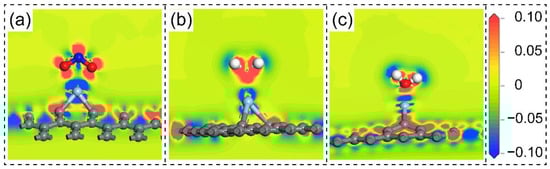 Humidity interference in the sensing process often influences the accuracy of the gas sensors. The cross-response of humidity should be suppressed. Therefore, the adsorption properties of water on Ag–Gr are studied. The adsorption distance of H2O on Ag–Gr is 0.2296 nm, less than Van der Waals radii (O = 0.155 nm, Ag = 0.177 nm). The adsorption energy (−0.930 eV) and Mulliken charge (0.122 e) show that the charge transfers from H2O (donor role) to Ag–Gr. In Figure 2c, after adsorption, the contribution from H2O electronic states to the total DOS of Ag–Gr is localized from −9.0 eV to −3.7 eV in valence bands and from 0.4 eV to 5 eV in conduction bands. Although H2O can interact with Ag–Gr, the interaction could be weakened by some suitable methods, such as heating through a microheater, which is demonstrated as an effective method in our previous work [].
