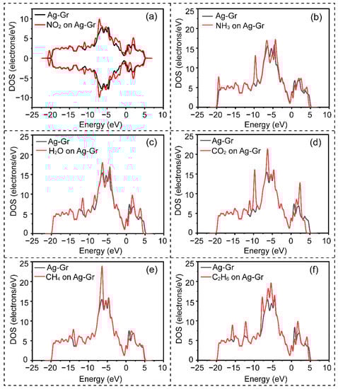 The DOS comparison of Ag–Gr and Ag–Gr adsorption with (a) NO2, (b) NH3, (c) H2O, (d) CO2, (e) CH4, and (f) C2H6.