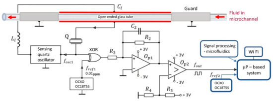 A sensitive capacitor of dimensions 50 mm × 1 mm is attached to the microchannel and connected in series with a capacitance-dependent quartz crystal Q. The oscillator frequency depends on the properties of the quartz crystal equivalent circuit and on the dielectric properties of the liquid and microchannel. The thin metal lines of the sensitive capacitor are positioned on the external side of the open-ended glass tube. As the capacitor plates are not in contact with the liquid, there is no need for compensation of the ionic conductivity and polarization of the electrodes [6]. The guard electrodes positioned on opposite sides of the open-ended glass tube reduce the fringing field effect [6]. The capacitance of the sensing capacitor, including the microchannel between the capacitor plates, is (load capacitance).