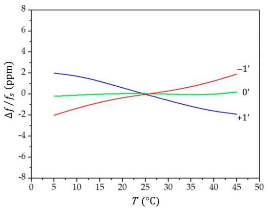 The change () in the resonant frequency () as a function of temperature () at different values of the crystal cut angle (−1′, 0′, and 1′). The intersection of the cubic parabola is at .