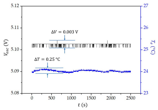 First, the stability of the oscillator voltage () was checked. The voltage measured over a time span of approximately min is shown in Figure 6. The stability was measured by the HP6632A system with a DC power supply and with the accuracy of the set voltage being 0.01%. We see that the voltage fluctuates only by , and it is unaffected by a slight variation in the temperature of the environment, which was kept at approximately . The temperature of the environment was measured by a low-power linear active thermistor MCP9701A, the measuring range , and an accuracy of . The sensor was connected to a 12 bit PIC microcontroller PIC18F27J53.