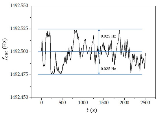 The stability of the measured frequency () is shown in Figure 7. As already explained, we do not directly measure the resonant frequency but rather transform this frequency into a lower (kHz) frequency range, which increases the accuracy of the frequency reading by three orders of magnitude. The frequency was monitored for 2-propanol over a period of approximately 40 min. The temperature of the 2-propanol was kept constant at the environment temperature (. We see that the frequency reading fluctuates on the level of .