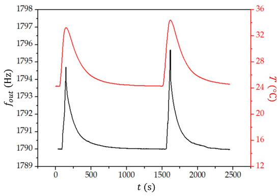 Figure 8 presents the time dependence of the frequency reading () and temperature () of the toluene. Similar graphs were obtained for 2-propanol and water, as well.