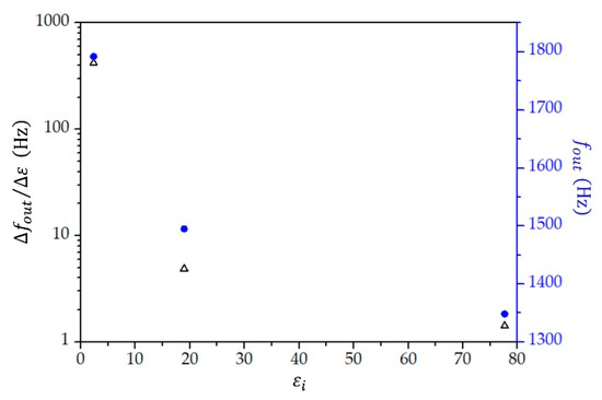 The sensitivity (black triangles) and measured frequency (filled blue circles) as a function of relative permittivity ().
