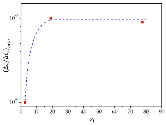 The minimum detected relative change in the relative permittivity as a function of the relative permittivity (red squares). The dashed blue curve presents a sensitivity curve drawn by feeling and serves as a guide for the eye.
