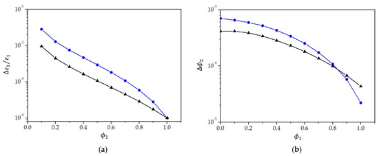 for the model by Lichtenecker–Rother. Similarly, and can be obtained from Equations (16) and (17). To calculate the right-hand sides of Equations (18) and (19), we note that and are, in fact, the sensitivity given in Figure 11. By using the sensitivity given in Figure 11 and the calculated values of the relative permittivity of the mixture (Table 3), Equations (18) and (19) can be evaluated at different values of . In such a way, we obtain the minimum relative change in that can be detected by the proposed measuring method. The sensitivities predicted by the two theoretical models are given in Figure 12a. We see that the relative changes in the relative permittivity of the toluene of the order of can be detected if toluene prevails in the mixture, while at low volume fractions of toluene (), percentile changes can be detected. Sensitivity decreases if the volume fraction is even lower. The model of Lichtenecker–Rother predicts a slightly higher sensitivity. While the sensitivity for detecting changes in the value of strongly depends on the volume fraction of toluene, the sensitivity for detecting changes in the value of the relative permittivity of ethyl alcohol is of the other of at volume fractions and then decreases if is further reduced.