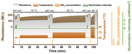 Comparison of photoregeneration and temperature regeneration under dark conditions—sequence of one photoregeneration cycle (pulses of 30 s of illumination and 30 s of waiting) and three different (10, 20, and 40 °C) temperature regeneration cycles (pulses of 30 s of raised temperature and 30 s of waiting) after NO2 exposure.